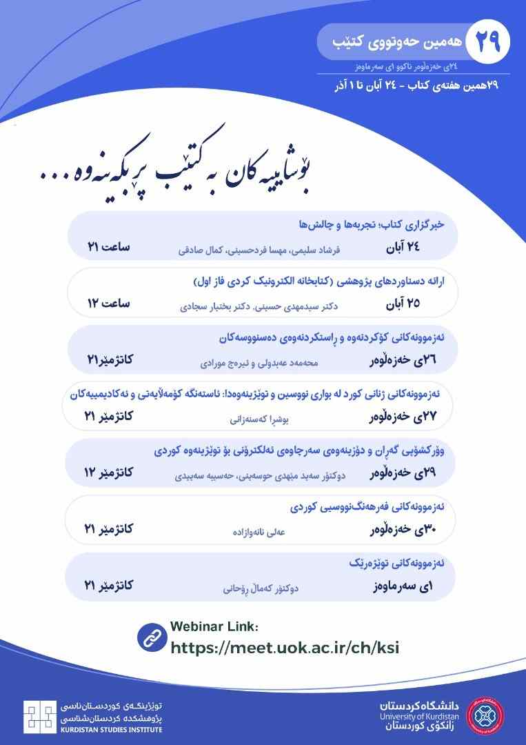 پژوهشکده کردستانشناسی دانشگاه کردستان به مناسبت «بیست و نهمین هفته کتاب» مجموعه وبینارهایی را با حضور نویسندگان و پژوهشگران برگزار میکند.